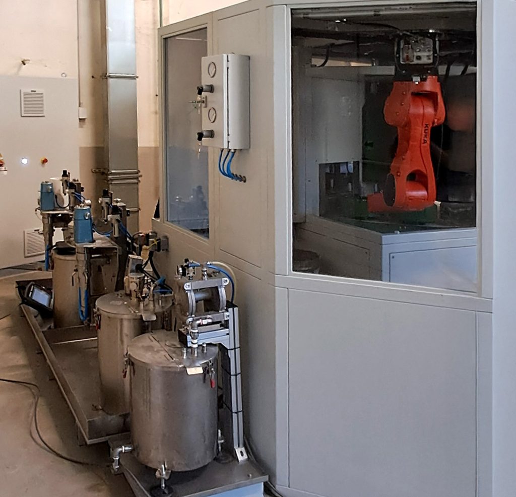 - The automated spindle system allows for a wide range of formats to be handled, while the product is applied using an automatic gun integrated into the wrist of an anthropomorphic robot installed in an upside-down configuration.